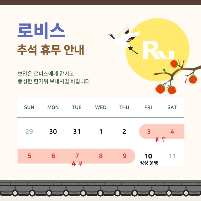 안녕하세요. 유/무인 매장 무인화솔루션 전화출입인증 시스템 전문 기업 로비스입니다. 2025 추석연휴 운영안내 드립니다. ![]() 풍성한 한가위 되시길 바라며 10/9 까지 상담 센터는 운영 중지되오니 이 점 유의해주시기 바랍니다. 감사합니다. |